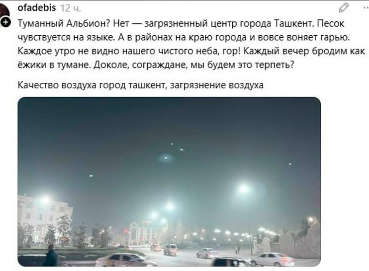 Jumladan, 20 noyabr kuni avtomatik monitoring stansiyalari ma’lumotlariga ko‘ra, Toshkent havosidagi mayda zarrachalar (RM10) darajasi kubometr uchun 299 mikrogrammni tashkil etgan, bu ruxsat etilgan maksimal konsentratsiyadan (300 mkg/m³) oshmagan. Biroq, RM2.5 darajasi 202 mkg/m³ ga yetgan, bu standartdan 3,4 baravar (60 mkg/m³) yuqori.
